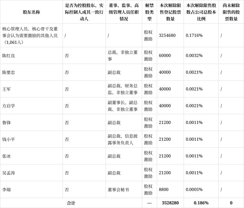 此次解禁股东分别为核心管理人员、核心骨干及董事会认为需要激励的其他人员(1,061人)、陈红良、陈要忠、王军、方启学等,对应解禁股份分别为325.47万、6万、4万、4万、4万。