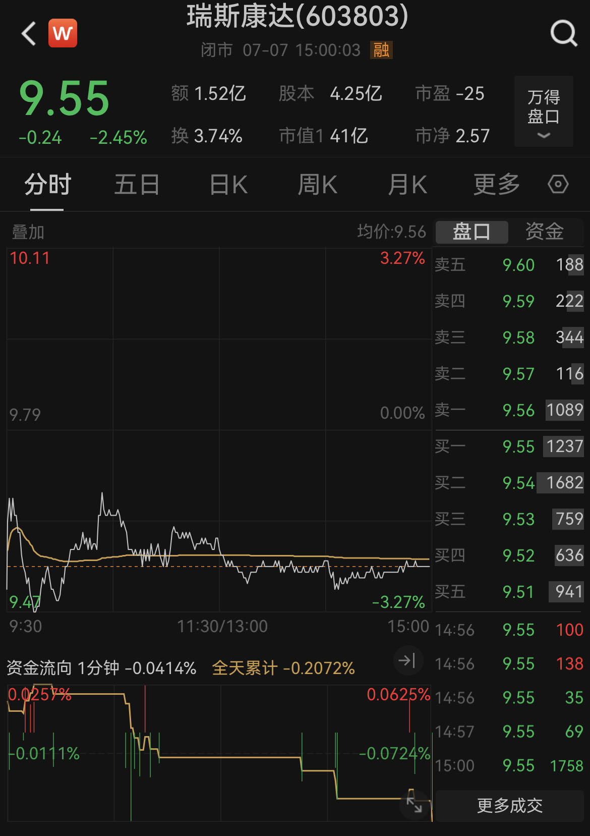 二级市场方面,截至7月7日收盘,瑞斯康达报9.55元/股,日内下跌2.45%。