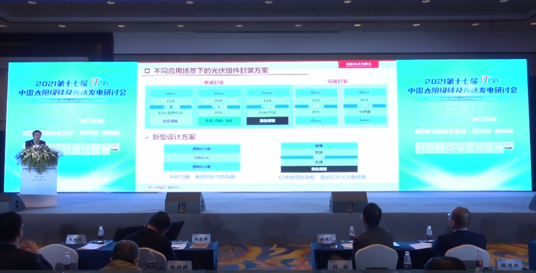 福斯特总经理周光大博士在主会场做了题为《光伏组件封装方案的演变与未来》的报告。报告指出,光伏电池与组件技术的变革(双面化、大尺寸化、高效化等),推动了封装胶膜的发展;而封装胶膜的与时俱进与差异化进一步推动了电池组件的封装方案的演变,从而为客户和行业的发展创造更高的价值。