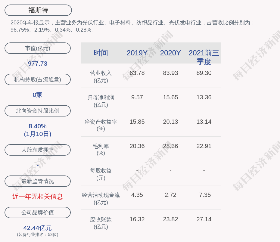 2020年年报显示,福斯特的主营业务为光伏行业、电子材料、纺织品行业、光伏发电行业,占营收比例分别为:96.75%、2.19%、0.34%、0.28%。