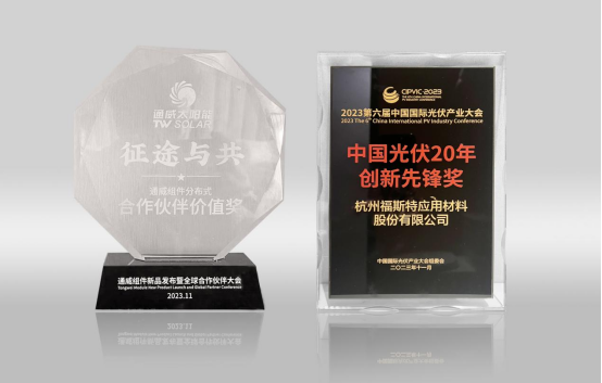 福斯特和通威股份深度合作多年,福斯特全系列的胶膜供应,多维度的产品保障,不仅满足了通威日益增长的需求,还得到了通威股份的一致认可。在本次大会上,福斯特荣获通威组件全球合作伙伴价值奖,以及中国光伏20年·创新先锋奖荣誉。