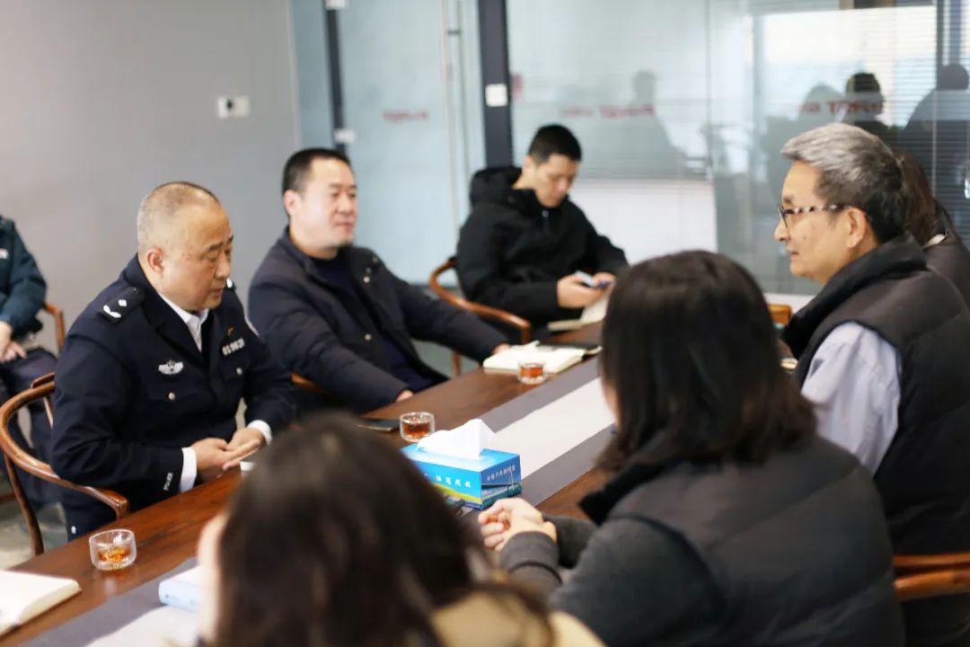 2023年12月20日上午,临安区公安分局政委方远峰、党委委员副局长吕华军、分局经侦大队大队长郑柏林、分局锦北派出所所长丁新腾、分局法制大队大队长孔涵、分局反恐大队大队长鲍树良领导一行莅临福斯特交流指导,福斯特董事长林建华、投资管理中心总监刘彧、人力资源中心总监安望飞热情接待。