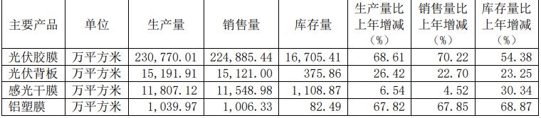 产销量方面,福斯特旗下各类产品当年均有不同幅度的增长,两大主力产品涨幅较为明显,其中光伏胶膜产品产销量同比增长均超五成。
