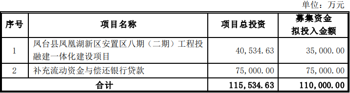 本次募资投向的凤台县凤凰湖新区安置区八期(二期)工程投融建一体化建设项目,工程地点为凤凰湖新区,总建筑面积约17.29万平方米,项目包括11栋27层住宅,1栋3层社区用房、幼儿园、地下车库,2栋大门及门卫、配电房等。该项目投资概算需要投资4.05亿元,拟使用募集资金3.5亿元。