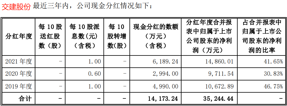 据披露,交建股份最近三年以现金方式累计分配的利润共计14173.24万元,占最近三年实现的年均可分配利润11748.15万元的120.64%。从分红比例来看,最近三年的分红均超过净利润的30%。
