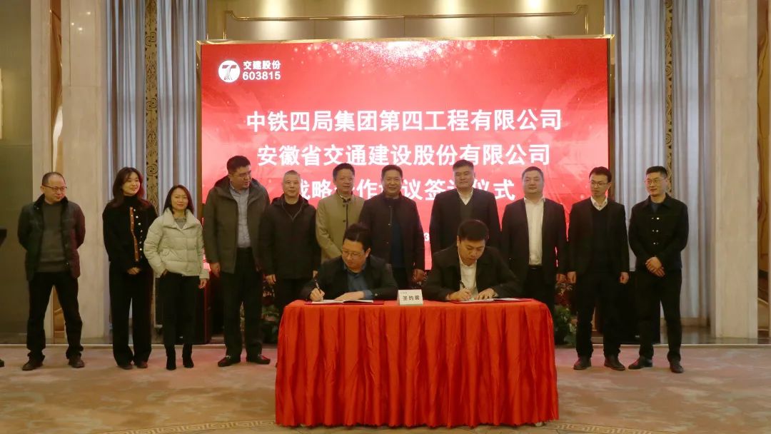 近日,安徽省交通建设股份有限公司与中铁四局集团第四工程有限公司签署战略合作协议,中铁四局集团第四工程有限公司党委书记、执行董事彭永,安徽省交通建设股份有限公司党委书记、董事长胡先宽等出席了签约仪式。根据协议,双方将围绕高速公路、市政工程、城市轨道交通、乡村振兴等领域的投资、建设、运营,以股权投资、基金认购、PPP、F+EPC等多种模式进行多层次、多渠道合作,完善合作机制,落实合作项目,实现高质量可持续发展。