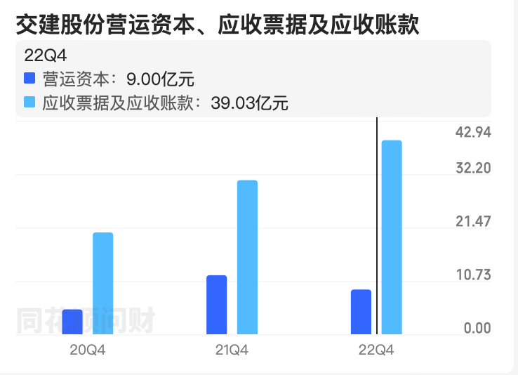 此外,交建股份的应收账款不断抬升。2020年末,公司应收票据及应收帐款规模为20.49亿元,这一数据在2022年末已增至39.03亿元。