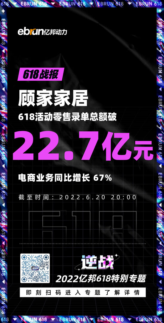 6月20日消息,在618大促期间(5月16日-6月20日20:00),顾家家居零售录单总额(零售分销系统录入订单金额)达22.71亿元,同比增长38.3%。其中,全屋定制(预订单)同比增长82%、功能品类(顾家品牌)同比增长70%、融合大店(同店口径)同比增长48%、电商业务同比增长 67%,以及天禧派品牌同比增长91%。