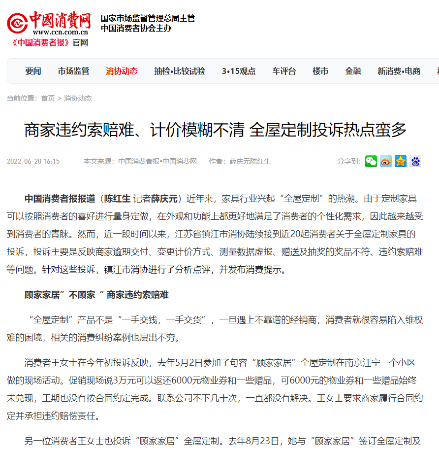 近年来,家具行业兴起“全屋定制”的热潮。由于定制家具可以按照消费者的喜好进行量身定做,在外观和功能上都更好地满足了消费者的个性化需求,因此越来越受到消费者的青睐。然而,近一段时间以来,江苏省镇江市消协陆续接到近20起消费者关于全屋定制家具的投诉,投诉主要是反映商家逾期交付、变更计价方式、测量数据虚报、赠送及抽奖的奖品不符、违约索赔难等问题。针对这些投诉,镇江市消协进行了分析点评,并发布消费提示。