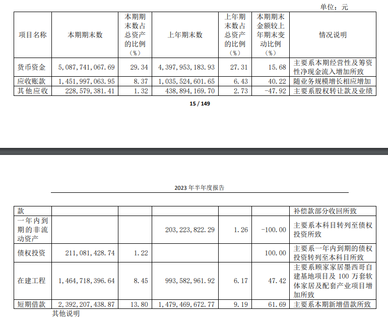 从资产及负债情况来看,顾家家居货币资金为50.88亿元,占总资产比例为29.34%,同比增15.68%,主要因本期经营性及筹资性净现金流入增加所致。