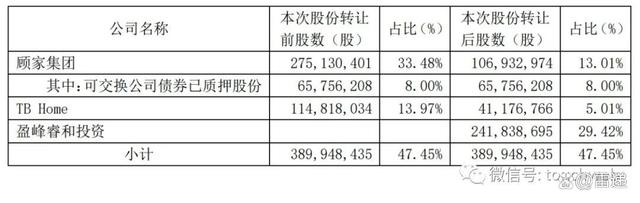 盈峰睿和投资以协议转让的方式受让顾家集团和TB Home共计持有的241,838,695股顾家家居股份,占顾家家居总股本的29.42%,转让价格调整为人民币36.7187元/股,转让总价款调整为人民币88.8亿元。