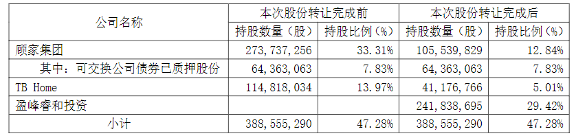 本次交易完成后,顾家家居的控股股东将由顾家集团变为盈峰睿和,公司实际控制人也将由顾江生、顾玉华和王火仙变为何剑锋;顾家集团、TB Home Limited仍分别持有顾家家居12.84%、5.01%的股权。