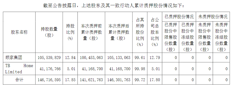截至公告披露日,顾家集团及其一致行动人共同持有公司股数已累计质押99.72%。其中,顾家集团有限公司所持有的顾家家居股份有限公司1.06亿股股票,占公司总股本的12.84%。本次部分股票质押后,顾家集团累计质押股票1.05亿股,占其所持有公司股数的99.61%,占公司总股本的12.79%。顾家集团及其一致行动人合计持有公司1.47亿股股票,占总股本的17.85%。