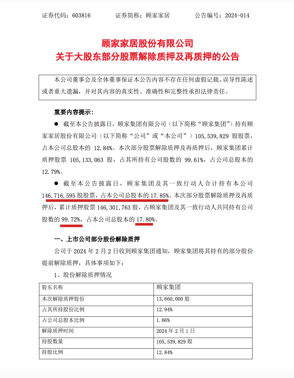 具体解除质押情况为,顾家集团于2024年2月1日解除质押1366万股,占其所持股份的12.94%,占总股本的1.66%。而这部分解除质押的股份已用于再质押。质押融资用途显示为补充流动性。
