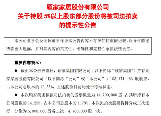 顾家家居强调,顾家集团不属于公司控股股东,其所持公司股份被司法拍卖不会导致公司控制权发生变更,不会影响公司的生产经营。本次司法拍卖尚处于公示阶段,后续涉及竞拍、缴款、股权变更过户等环节,拍卖的结果具有不确定性,公司将密切关注上述事项的进展情况。
