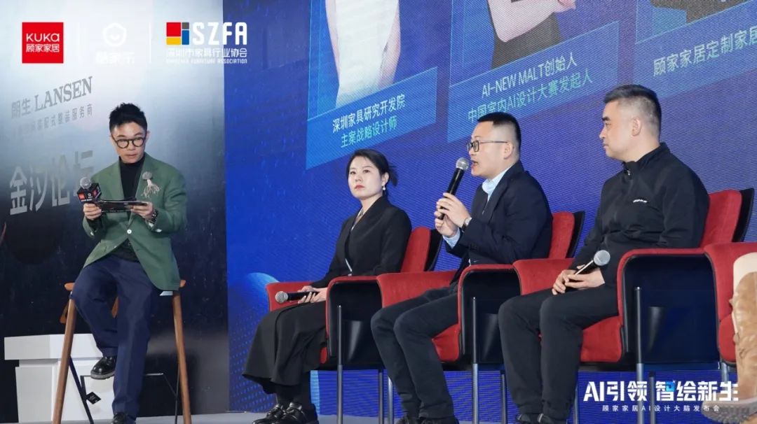 (从左至右分别是深圳市家具行业协会新媒体中心主任崔卓君、AI-NEWMALT创始人&中国室内AI设计大赛发起人张月新、顾家家居定制家居事业部政委邓涛、群核科技副总裁、酷家乐大家居KA事业群总经理汤锡峰)