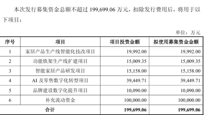 针对募集资金用途,顾家家居表示,通过此次向特定对象发行股票,公司将筹集资金用于家居产品生产线智能化技改项目、功能铁架生产线扩建项目、智能家居产品研发项目、AI及零售数字化转型项目、品牌建设数字化提升项目以及补充流动资金。这些项目的实施将有效优化产能布局,扩大公司生产规模,进一步夯实数字化运营管理能力,提升产品质量与技术水平,增强品牌影响力,从而进一步增强公司的核心竞争力,巩固市场地位。