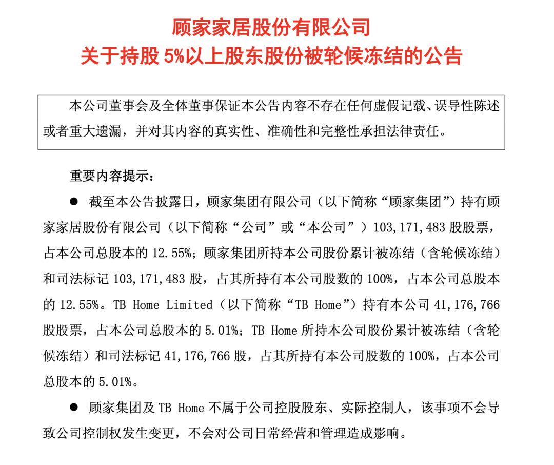 直到最近这些影响依然存在。据顾家家居披露,分别持股12.55%和5.01%的顾家集团和TB Home各自所持有的股份均处于冻结状态(含轮候冻结)。顾家集团为公司的原控股股东,而TB Home为其一致行动人。