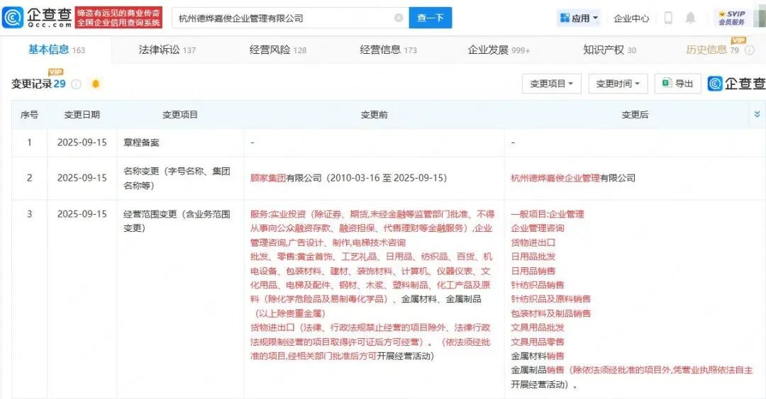 近日,顾家集团有限公司发生工商变更,企业名称变更为杭州德烨嘉俊企业管理有限公司,同时,经营范围变更为“企业管理咨询;货物进出口;日用品批发;日用品销售;针纺织品销售等”。