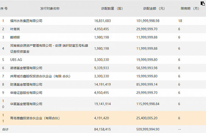海峡环保披露非公开发行股票发行情况报告书,此次发行的价格确定为6.06元/股,发行数量确定为84,158,415股,实际完成募资5.1亿元。本次认购对象共有福州水务集团、诺德基金、UBS AG、深港证券等10家投资者。此次发行的投资者具体获配情况如下: