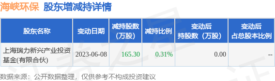 6月12日海峡环保发布公告《海峡环保:海峡环保股东减持股份结果公告》,其股东上海瑞力新兴产业投资基金(有限合伙)于2023年4月27日至2023年6月8日间合计减持165.3万股,占公司目前总股本的0.3093%,变动期间该股股价上涨7.6%,截止6月8日收盘报6.23元。
