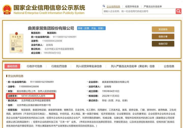 据乐居财经查阅,曲美家居成立于1993年4月10日,法定代表人为赵瑞海,注册资本为5.87亿元,经营范围包括制造家具;普通货物运输;家庭装饰装璜;销售百货、五金交电、化工原料、民用建材、工艺美术品等。该公司大股东为赵瑞海,持股持股21.75%。目前该公司有19家对外投资企业,包括智美创舍家居(上海)有限公司等。