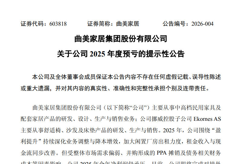 1月11日,曲美家居(603818.SH)发布关于公司2025年度预亏的提示性公告。