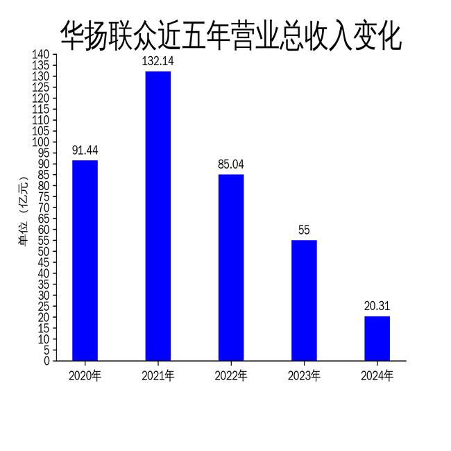 华扬联众2024年的营业总收入仅为20.31亿元,较2023年的55.00亿元大幅下降63.07%。这一下滑趋势并非偶然,而是公司近年来营收持续萎缩的延续。2022年公司营收为85.04亿元,2021年为132.14亿元,2020年为91.44亿元,整体呈现逐年下降的趋势。