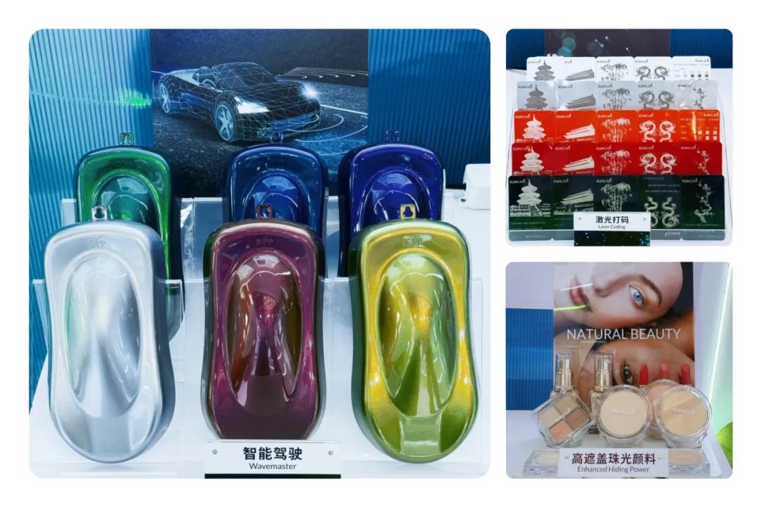 三个系列展示了坤彩科技在汽车级、工业级和化妆品级珠光材料的技术创新与突破,搭建技术矩阵同时覆盖汽车、工业、美妆赛道,展现了坤彩作为材料企业从单一产品到全场景解决方案的能力,成为此次展会创新材料展区的焦点。