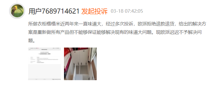 另有用户反映:所做衣柜榻榻米近两年来一直味道大,经多次投诉,欧派拒绝退款退货,给出的解决方案是重新做所有产品,但不能够保证能够解决现有的味道大问题。现欧派迟迟不予解决问题。