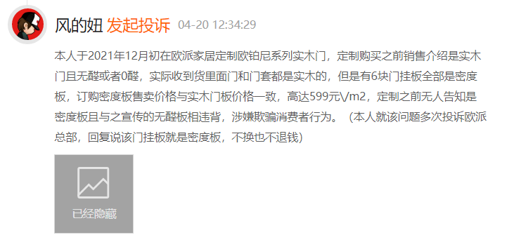 4月20日,黑猫投诉上,有用户反映:2021年12月初,在欧派家居定制欧铂尼系列实木门,购买前销售介绍是实木门且无醛或0醛,实际收到货里面门和门套都是实木的,但有6块门挂板全部是密度板,订购密度板售卖价格与实木门板价格一致,高达599元\/m2,定制之前无人告知是密度板且与之宣传的无醛板相违背,涉嫌欺骗消费者行为。(本人就该问题多次投诉欧派总部,回复说该门挂板就是密度板,不换也不退钱)。