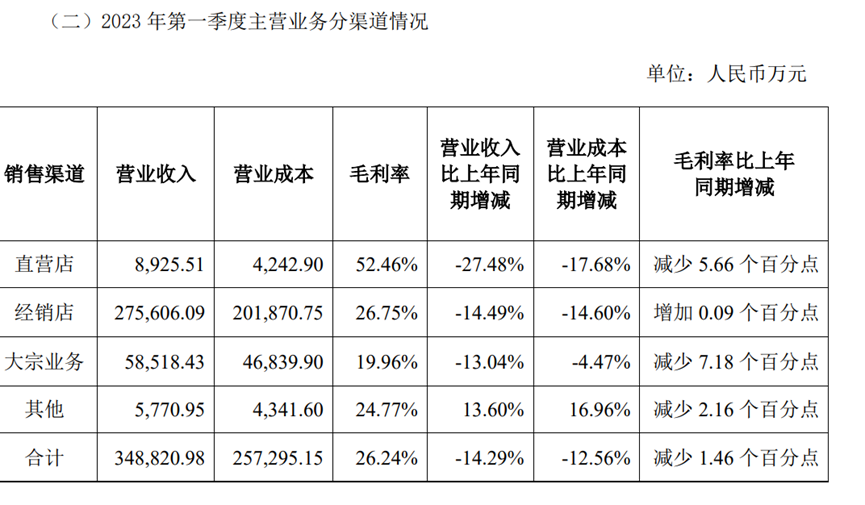 分渠道来看,毛利最高的直营店渠道,营收下滑幅度最严重,达27.48%,毛利率减少5.66个百分点。占营收主要权重的经销店渠道,营业收入下滑14.49%,毛利率略有增加。