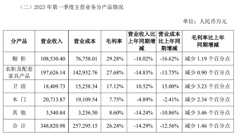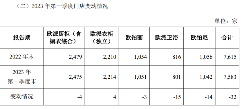 门店变动方面,截至第一季度末,欧派家居共有7583家门店,比2022年底减少32家,其中,欧派卫浴801家门店,比2022年底减少15家,欧铂尼1042家门店,比2022年底减少14家。