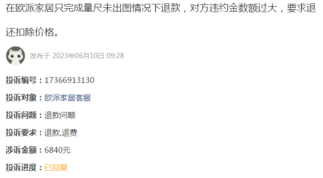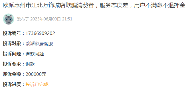 其中,有消费者在第三方投诉平台黑猫投诉投诉欧派家居,称欧派家居旗下门店服务态度差,称每次过去接待人员都不一样,每次都是预定时候承诺的家具换便宜货,忽悠消费者,于是要求退押金,超过承诺的15天仍未退款到账,无奈投诉至黑猫投诉。目前,该条投诉已完成,商家已经退款。