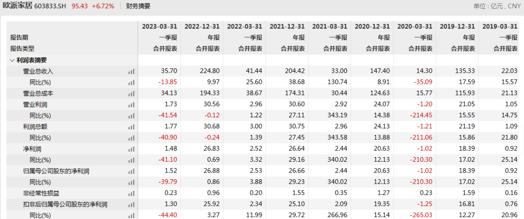 此外,欧派家居今年一季度业绩也出现下滑,营收35.7亿元,同比下降13.85%;归母净利润1.52亿元,同比下降39.79%。
