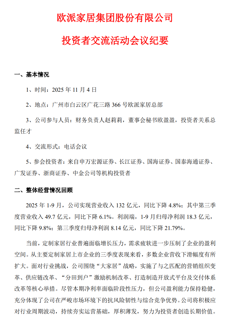 投资者交流活动会议纪要显示,当前,定制家居行业普遍面临增长压力,需求疲软进一步压制了企业的盈利空间。从主要定制家居上市企业的三季度表现来看,多数企业营收下滑幅度有所扩大。面对行业挑战,公司围绕“大家居”战略,实施了与之匹配的营销组织变革、供应链改革、“分田到户”激励机制改革、打造制造开放式平台及交付体系改革等核心举措。