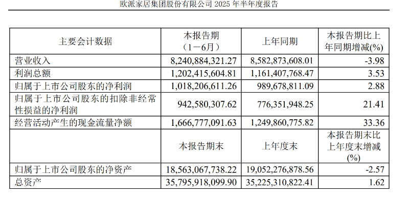 2025年上半年,欧派家居实现营业收入 82.41 亿元,同比下降 3.98%。公司指出在收入同比承压的情况下,公司通过科学设置集团利润绩效考核机制,持续加强成本及费用控制,推进各基地自动化产线升级,优化公司产品结构等,进一步释放利润空间。2025年上半年,公司实现归母净利润 10.18 亿元,同比增长 2.88%,实现扣非归母净利润 9.43 亿元,同比增长 21.41%。