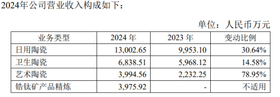 分产品来看,日用陶瓷营收1.3亿元,卫生陶瓷营收6837.51万元,艺术陶瓷营收3994.56万元,锆钛矿产品精炼业务营收3975.92万元。