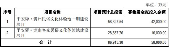 本次发行股票拟募集资金总额不超过58000.00万元(含本数),扣除发行费用后的募集资金净额拟全部用于平安驿·贵州民俗文化体验地一期建设项目、平安驿·龙南客家民俗文化体验地建设项目。