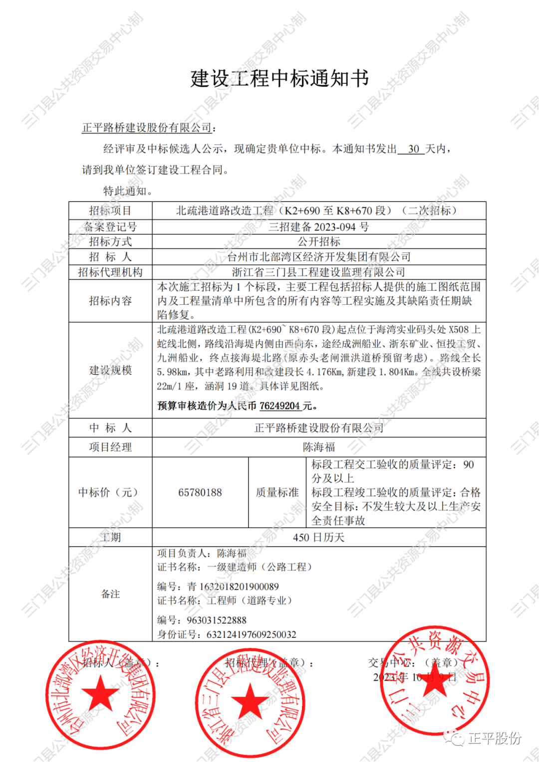 十月是收获的季节,写满了红色的记忆与历程,承载着播种与希望,中秋国庆双节刚过,正平股份就成功中标了浙江台州北疏港道路改造工程项目,为第四季度工作开了个好头!