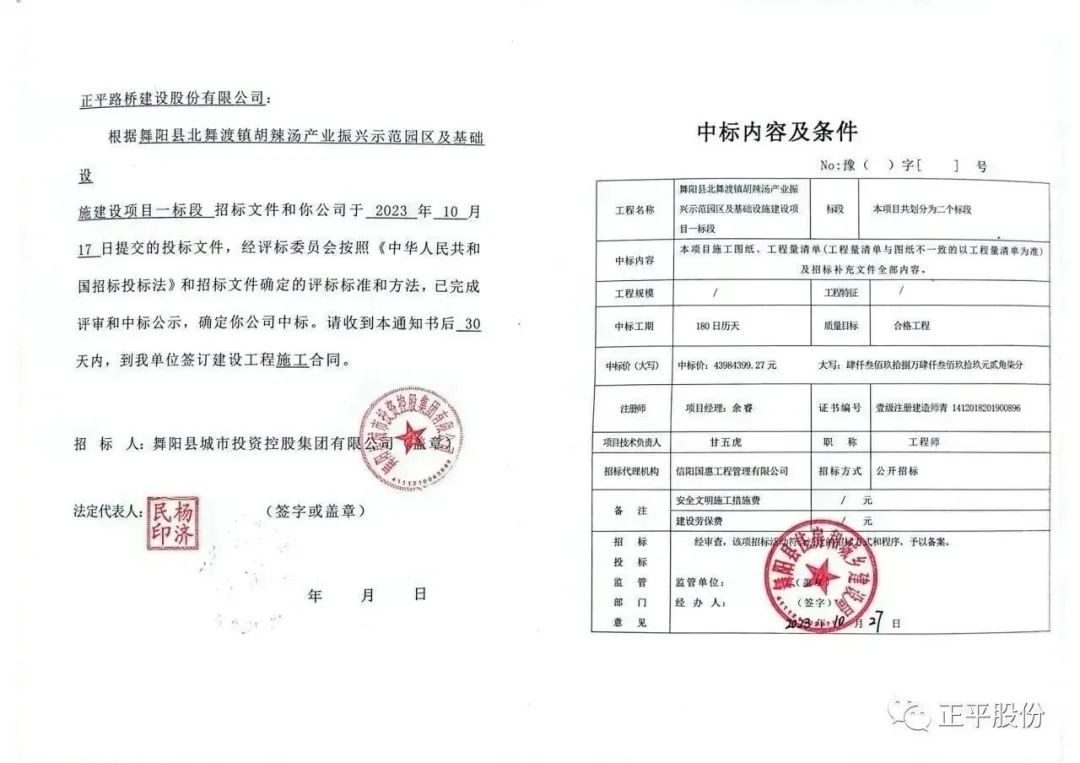 近日,正平股份中标河南省舞阳县北舞渡镇胡辣汤产业振兴示范园区及基础设施建设项目一标段,中标价4398.4万元,工期180天。这也是继今年9月份正平股份全资子公司正平建设集团有限公司为牵头人的联合体中标舞阳县北舞渡镇胡辣汤产业振兴示范园区建设EPC总承包项目后,公司在舞阳县又成功中标的一个市政工程建设项目。