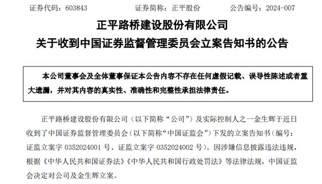 正平股份(603843)1月22日晚间公告,公司及实控人之一金生辉于近日收到中国证监会下发的立案告知书,因涉嫌信息披露违法违规,中国证监会决定对公司及金生辉立案。