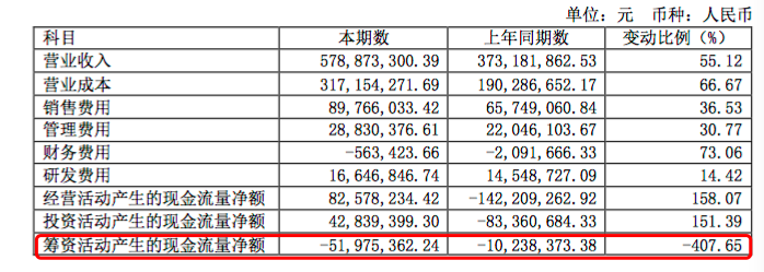 报告期内,其经营活动产生的现金流量净额为8258万元,同比增长158%。不过,筹资活动产生的现金流量净额为-5198万元,同比下降407.65%。