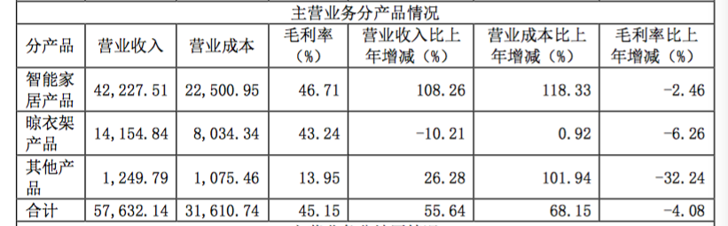 按产品分类,其主营业务之一智能家居产品包括智能晾衣机、智能门锁等智能产品,今年上半年实现营业收入为4.22亿元,同比增长108.26%;毛利率为46.71%,同比下降2.46%。