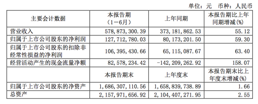 根据公告,公司实现营业收入约5.79亿元,同比增长55.12%;归属于上市公司股东的净利润约1.28亿元,同比增长59.3%。