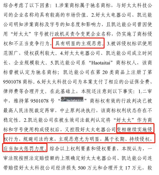 浙江省高级人民法院审理认为,好太太电器公司、凯达能公司明知涉案商标及字号的知名度和影响力,且凯达能公司曾因使用“好太太”字号被行政机关责令变更企业名称,仍实施了商标侵权和不正当竞争行为,具有明显的主观恶意。