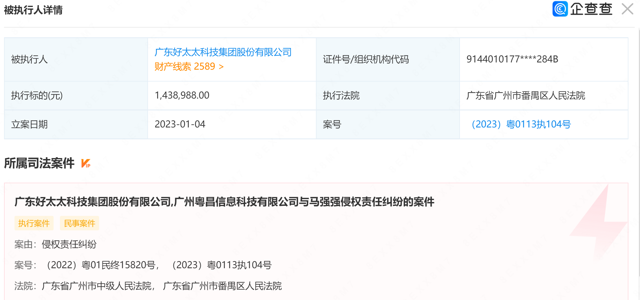 该案执行标的为143.9万元,执行法院为广东省广州市番禺区人民法院,立案日期为2023年1月4日,案号为(2023)粤0113执104号。