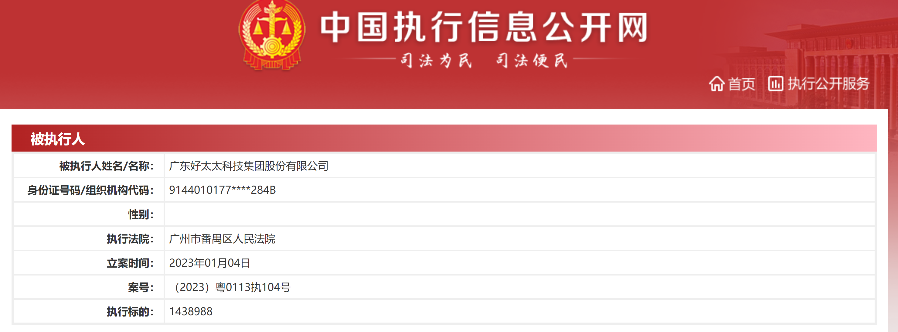 1月4日消息,广东好太太科技集团股份有限公司(以下简称“好太太”)新增一则被执行人信息。