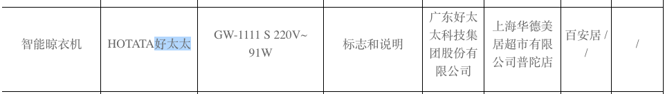 其中,标称生产企业为“广东好太太科技集团股份有限公司”的“智能晾衣机”,标称商标为“HOTATA好太太”,被抽样生产者、销售者为“上海华德美居超市有限公司普陀店”,标称规格型号为“GW-1111 S 220V~ 91W”,被检不合格项目为“标志和说明”。