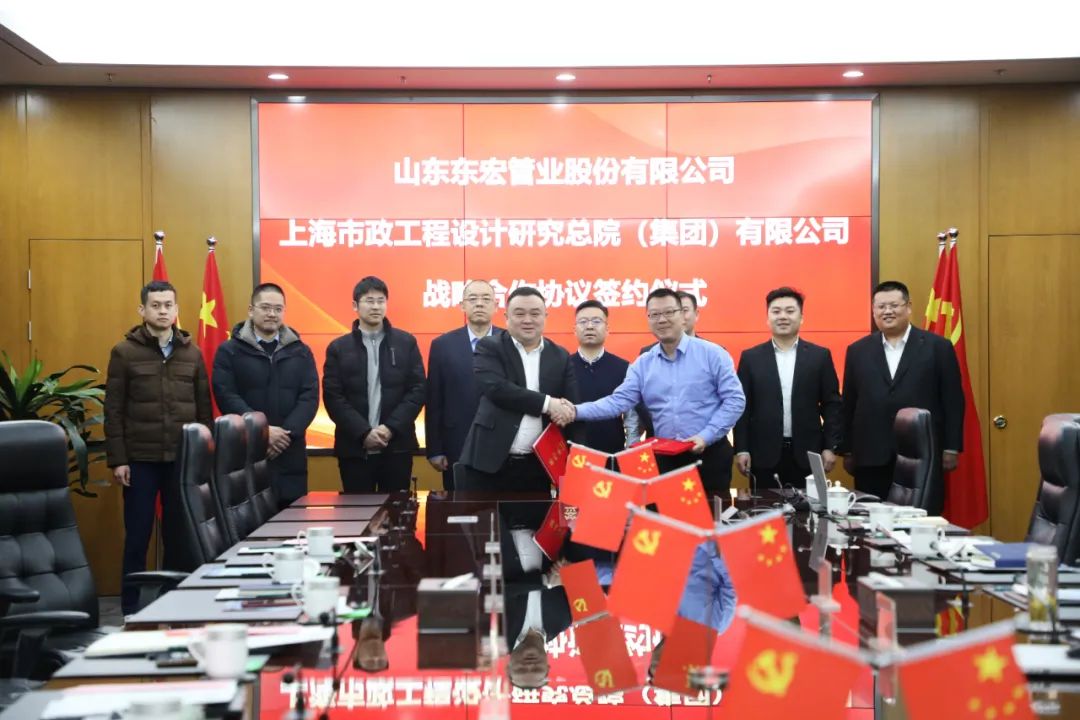 3月5日,山东东宏管业股份有限公司(以下简称“东宏股份”)与上海市政工程设计研究总院(集团)有限公司(以下简称“上海市政总院”)战略合作协议签约仪式在东宏股份研发中心举行。上海市政总院第一设计研究院副院长吕淼,东宏集团党委书记、董事长、东宏股份总裁倪奉尧出席仪式并致辞;签约仪式由东宏股份董事、总工程师孔智勇主持。